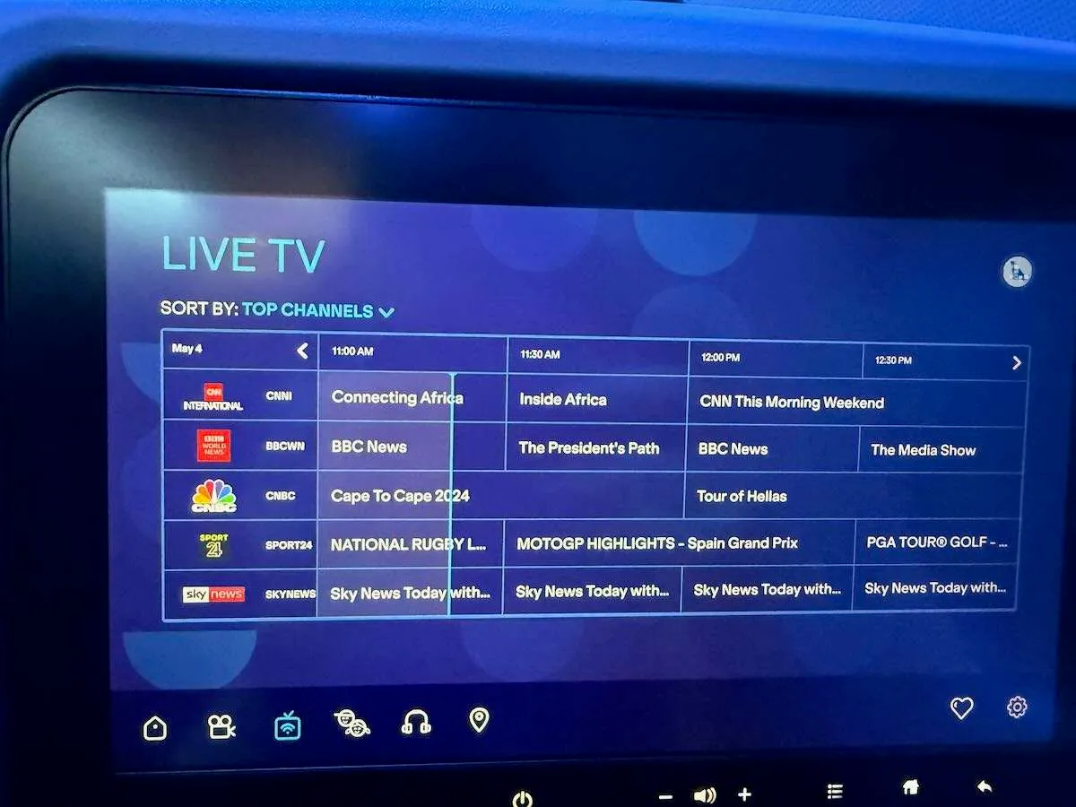 Every seat has a 10.1-inch HD touchscreen with a solid mix of movies, TV shows, and live TV. I didn’t test the full library exhaustively because I was busy doing other things (like drinking free wine, which we’ll get to), but the selection looked decent. Plus, I prefer the moving map to almost every other option!