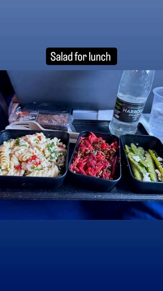 JetBlue partners with Dig for the cold meal service. I was offered a pasta salad (which I took) instead of the tofu and nettles option (which I did not take). It came with two side salads. It was… fine. Okay. Not amazing. Not offensive. Edible and sufficient.