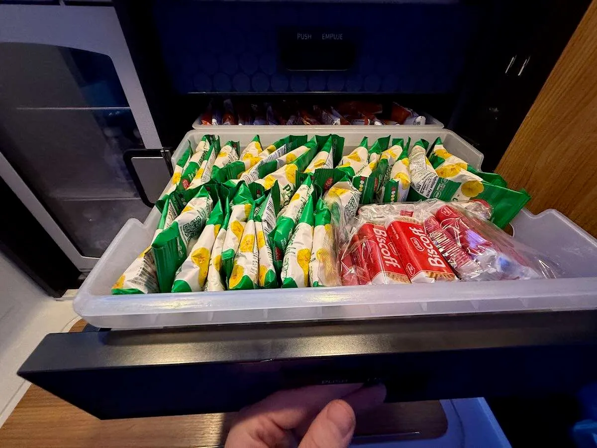 - Snacks are free, so take advantage. The pantry is open all flight. If the main meal isn’t thrilling, the crisps will feed you.