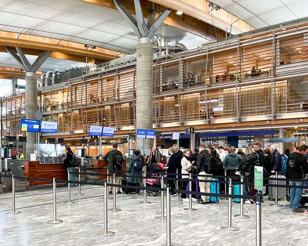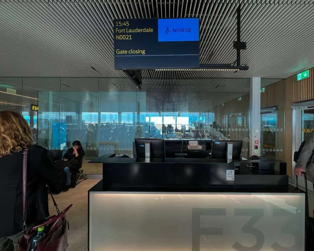Boarding was via Gate F33, right at the end of the concourse. Oslo Gardermoen is laid out with a sense of pared back chic, with warm woods and straight lines. At Gate F33, passports and boarding passes were pre-checked and passengers filtered into a holding area.