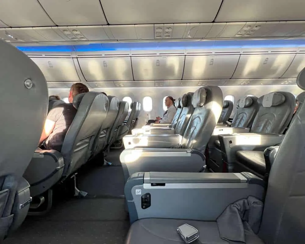 Cabin crew quickly got me settled in my new window seat and already the benefits were clear. The leg room is excellent and the seat pitch is a generous 43″. That’s substantially more than comparable Premium Economy seats on European airlines.