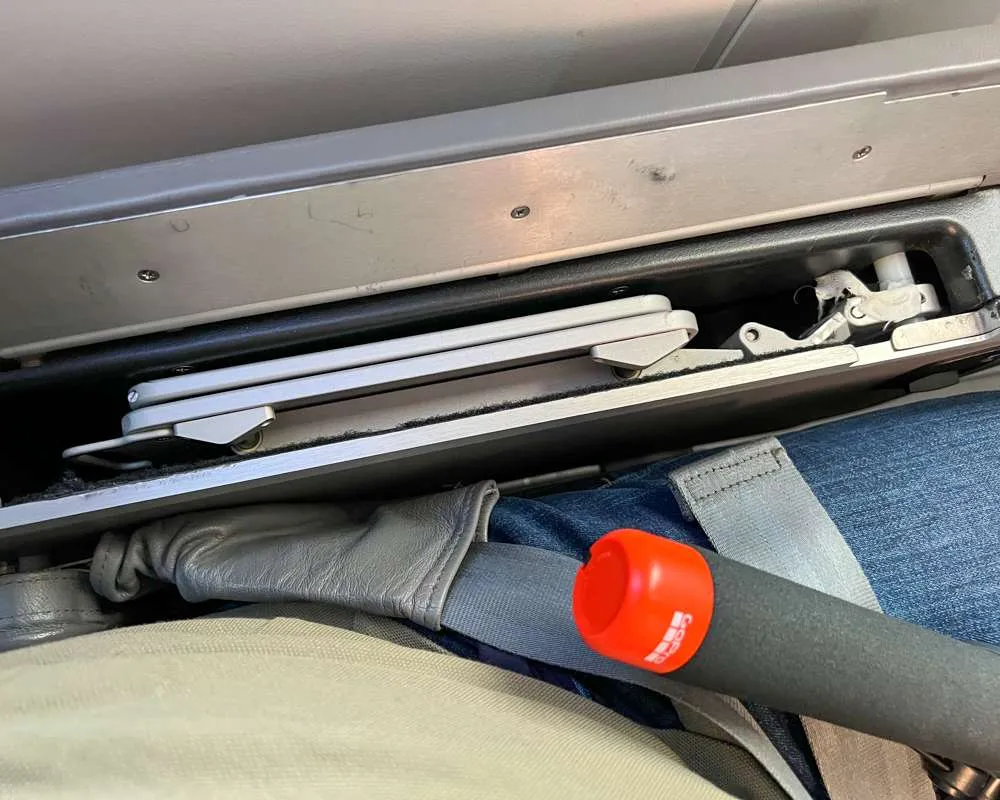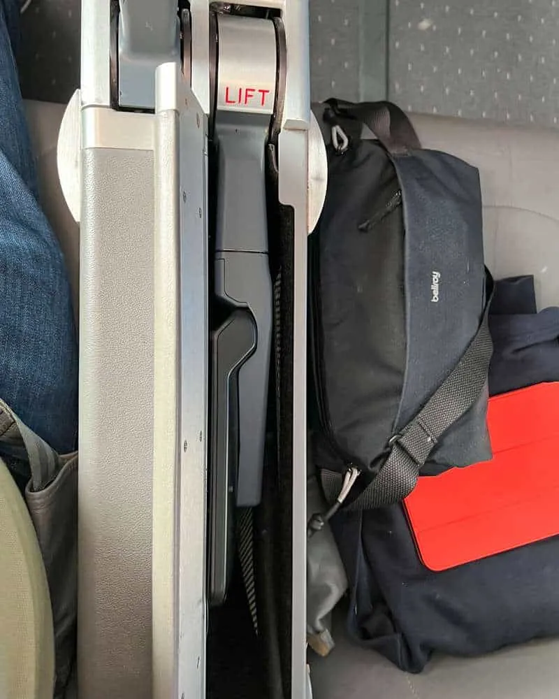To open the IFE screen, passengers raise the “Lift” lever shown in the image below. There are some manual controls for channels and volume on the affixed control panel shown and a headphone jack and USB Type A charger underneath each screen. Headphones are provided to Premium passengers, while Economy passengers have to pay $3.50 US. So bring your own!