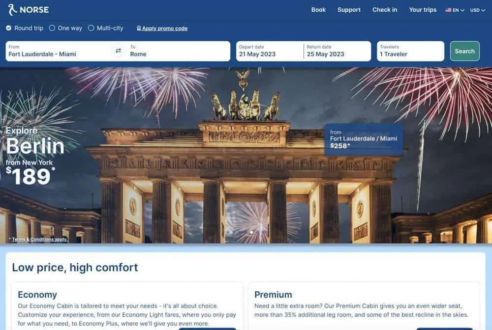 I wanted to travel from Oslo Gardermoen to Fort Lauderdale, Florida (sometimes known as Miami’s other airport). Norse’s online system is pretty straightforward to use. The ‘booking bar’ at the top of the page is so prominent and gets you right to the main options.