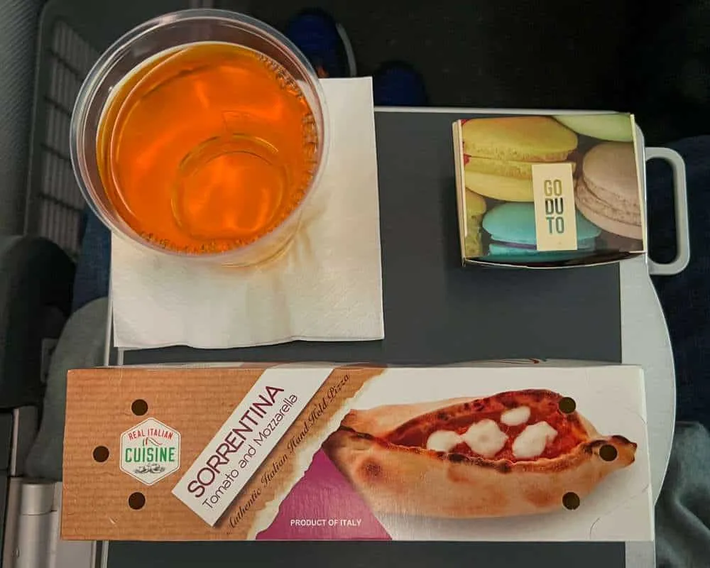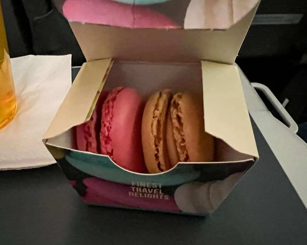 Around two hours before landing, a second meal service or snack was served. This consisted of a sort of folded pizza, which was piping hot (I managed to get some tomato juice right down my shirt! It was the perfect pre-landing snack alongside some very tasty macarons. These I usually find to be very pasty in texture, but this brand was fresh with one fruity raspberry macaron and the other a salted caramel flavour.