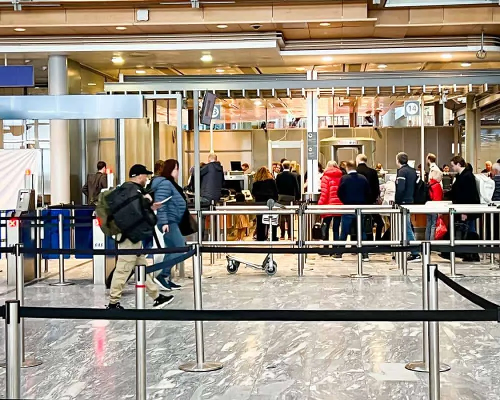 Security is right beside the check-in area at Oslo Gardermoen and the line was very reasonable. Trays were remarkably small and, as I travel with hand luggage only, it took a while for me to decant my bags for checking. Everything electronic, battery-operated or camera-related had to come out.