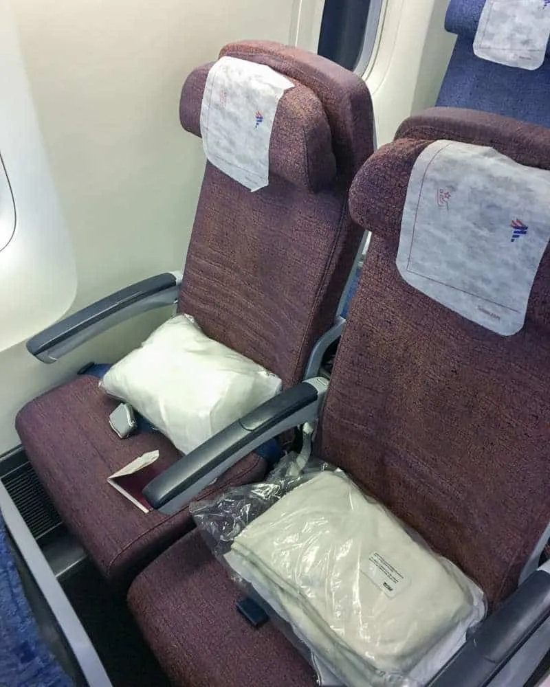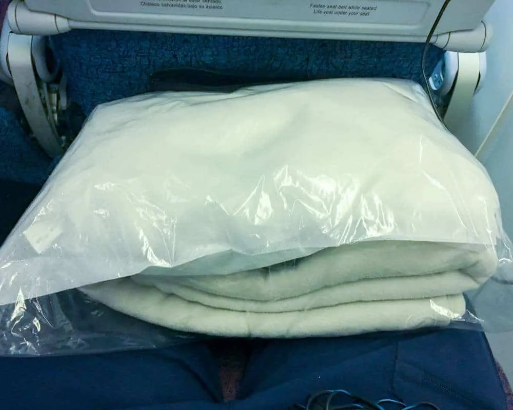 This contained a comfy micro fleece blanket and a flat pillow. I do travel with a more comfortable pillow. Find my latest one here.