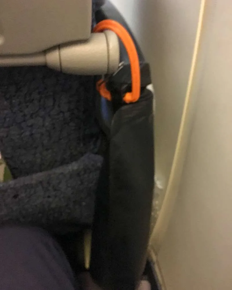 While settling into my seat and tucking my few in-flight possessions away, I realised that the carabiner on my Vapur water bottle was just big enough to clip on to the side of the table, or at least on the hinge part. Win! That kept it on hand but not taking up room.
