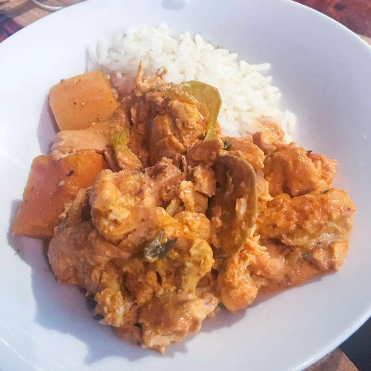 The chicken was tender and there was lots of butternut squash and other veggies in the dish.